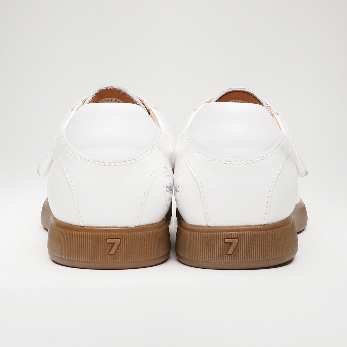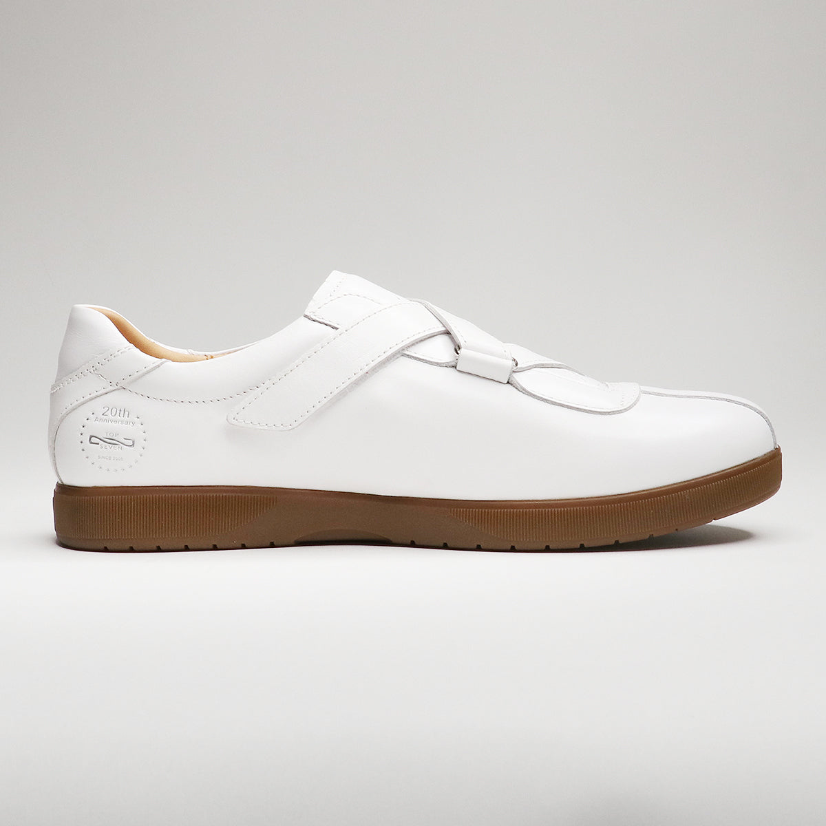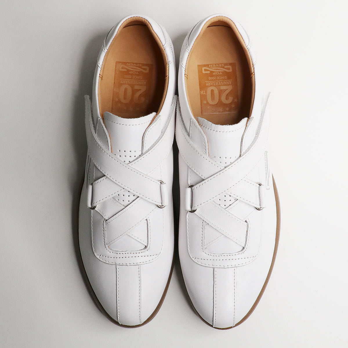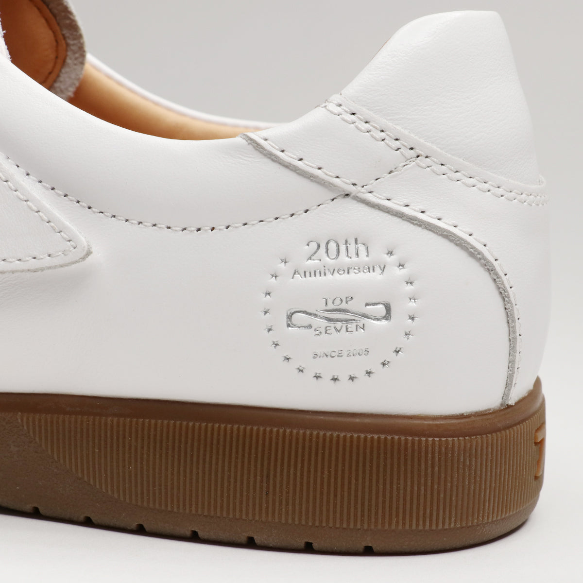 20周年記念モデルの特徴として、アッパーのカカトの内側には、20th記念の型押しロゴを外側にはトップセブン初期のシングル7のロゴを使用。また、インソールにも20th記念ロゴを型押ししており、10mm厚のクッション性の高いインソールを採用し、抜群の履き心地を実現しました。
