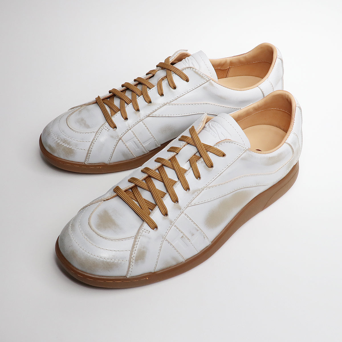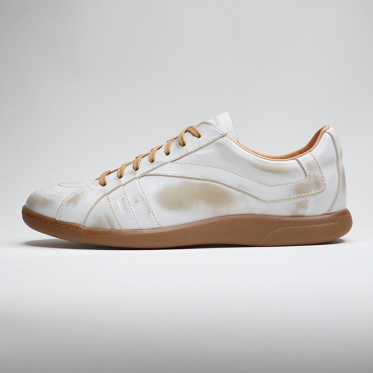 アッパーサイドやカカトにはエナメルレザーを使用し程よい光沢感が大人カジュアルを上品に魅せてくれるレザースニーカーになります。