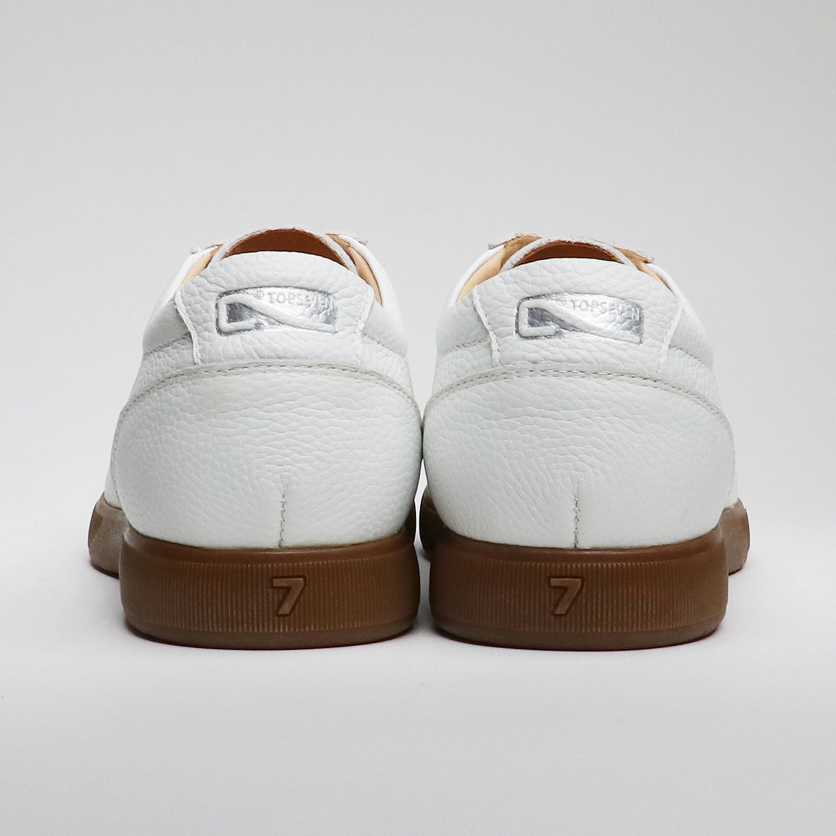 アッパー素材は、通常は凹凸の無いスムースレザー(本革)を使用していますが、シボのある本革のシュリンクレザーに変更し、通常バックカウンターには星形+7の刺繍がありますが、この記念モデルには初期に使用しておりました7のシングルロゴを使用し長年愛用して頂いている方には、懐かしい印象を感じて頂けてよりシンプルな印象になります。